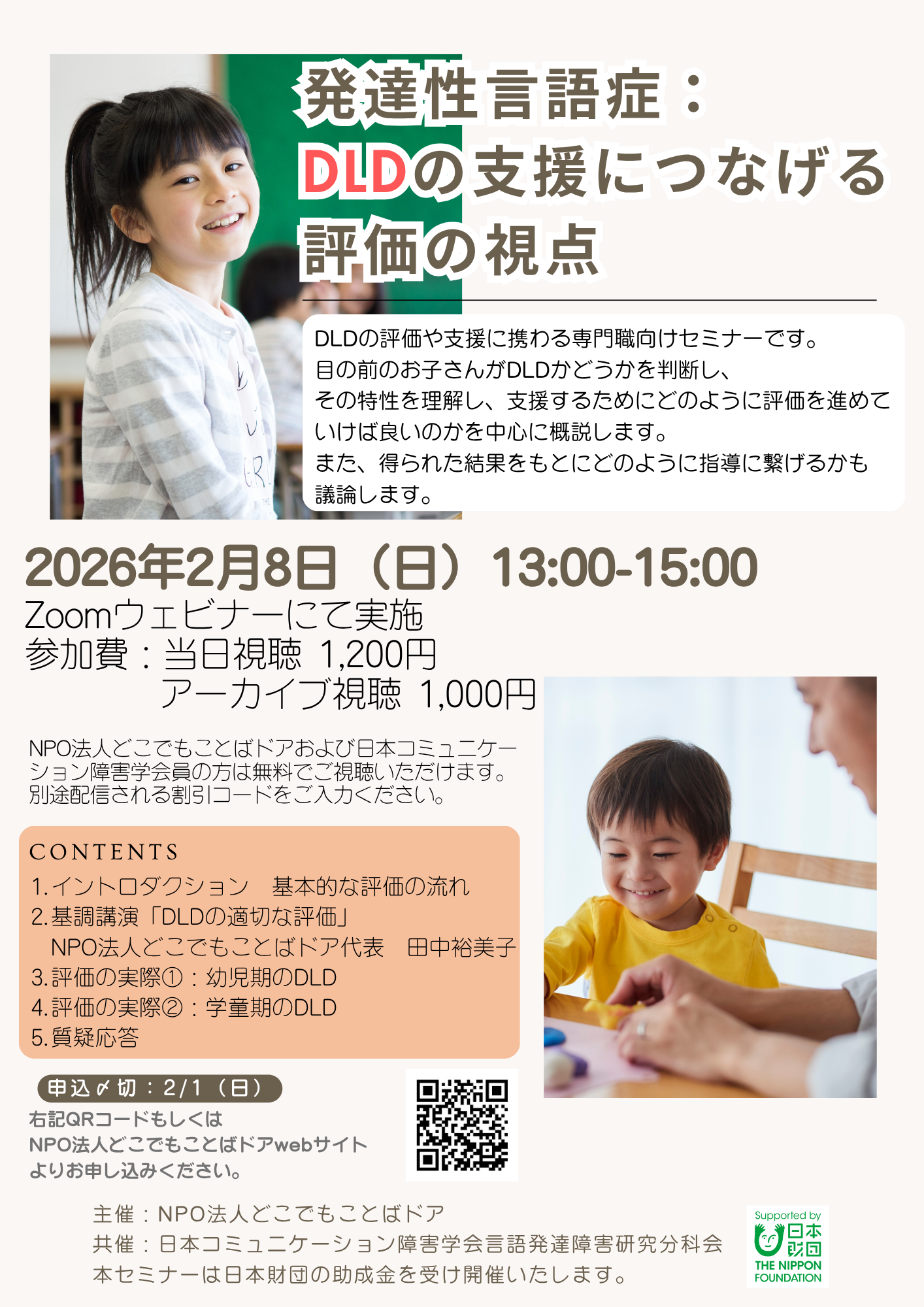 | 概要 | 研修概要: 本セミナーは、2025年10月に実施した「発達性言語症:DLDの理解とアプローチ」の発展編です(見逃し配信あります)。 目の前のお子さんがDLDかどうかを判断、その特性を理解し、 |